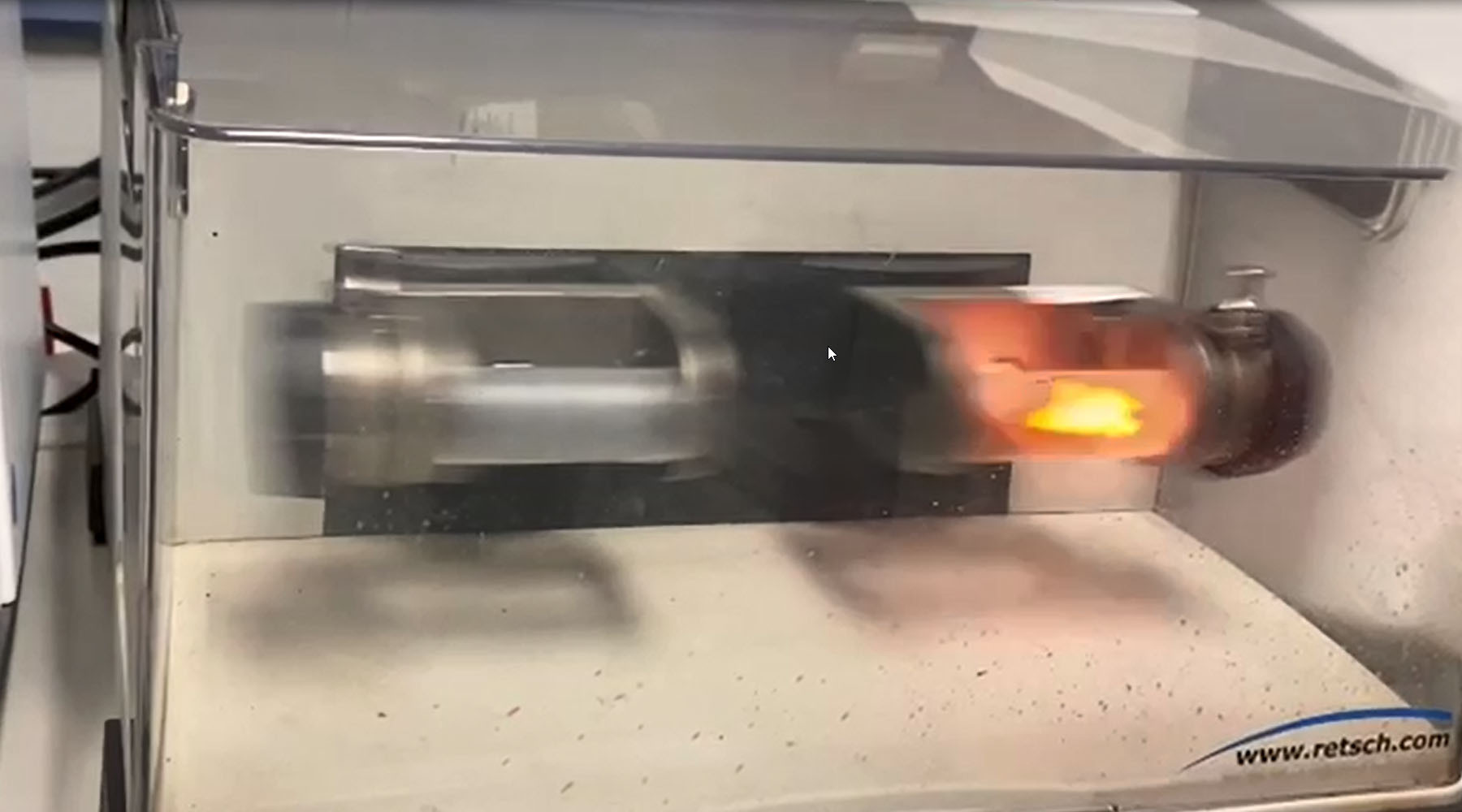 L'evento di reazione auto-propagante indotto meccanicamente nella sintesi è stato monitorato utilizzando il sistema GrindControl. Dopo 20 secondi di macinazione, si è verificata un'esplosione che ha portato a un sostanziale aumento della pressione da 0 a 730 mbar e a un aumento della temperatura. In questa applicazione, GrindControl ha permesso di osservare con precisione il tempo di accensione durante la sintesi, l'unico parametro di interesse per la reazione. [7]
