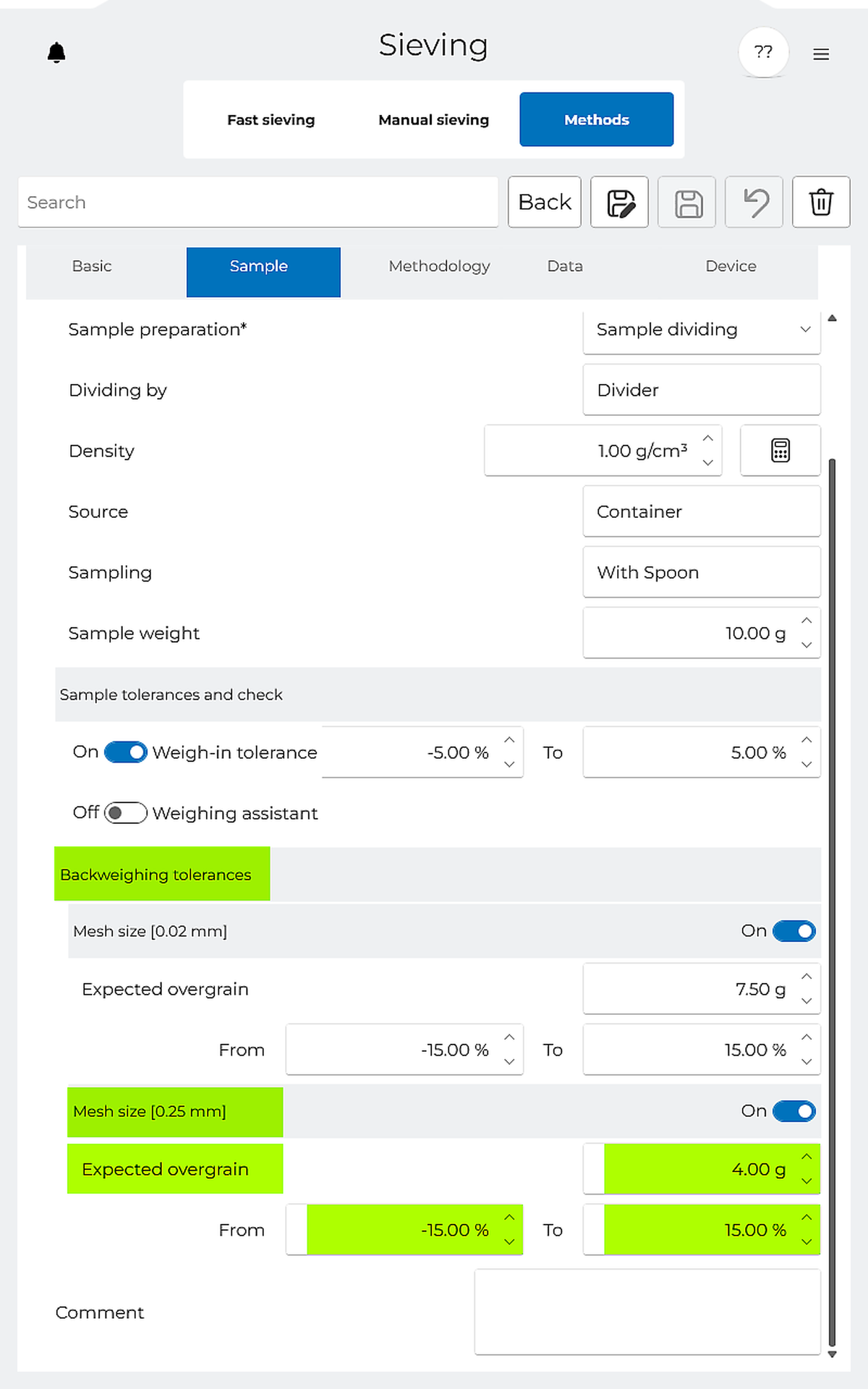 Does your sample comply with the preset quality limits? With the Backweigh-Tolerance, you can ensure that the particle size and particle size distribution of the sample meet your requirements.